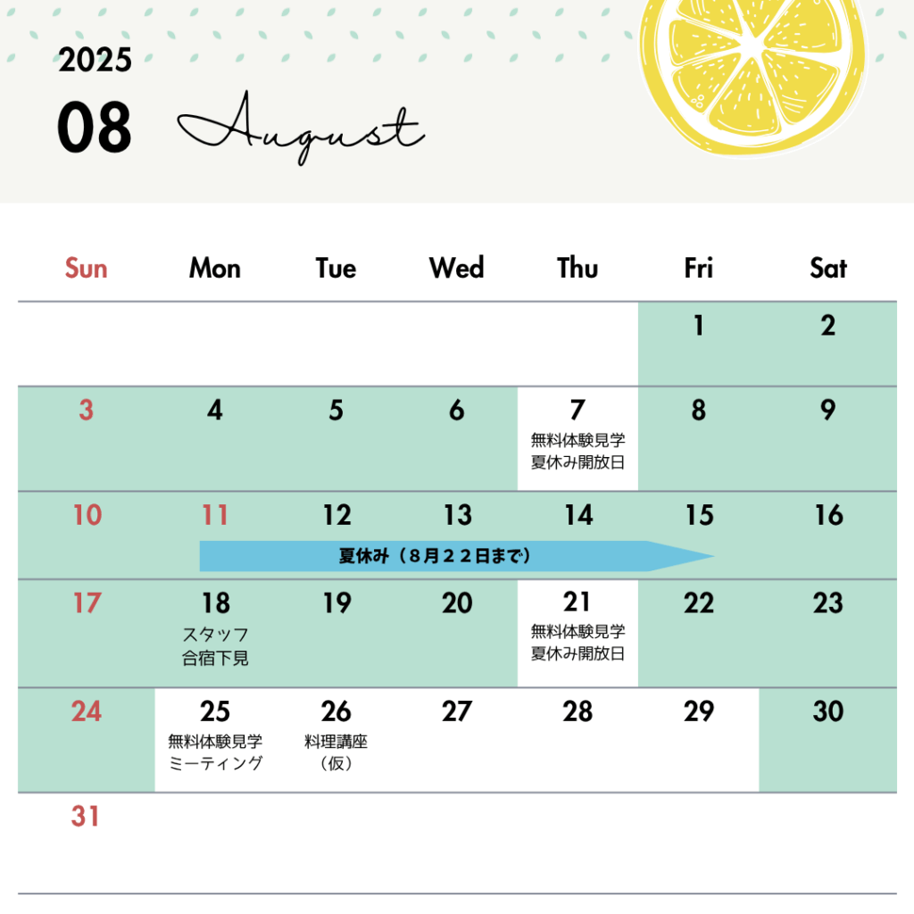 8月は主に夏休み期間となってしまいますが、7日、21日は夏休み開放日として開室し、それぞれ無料体験見学も受け付けております。