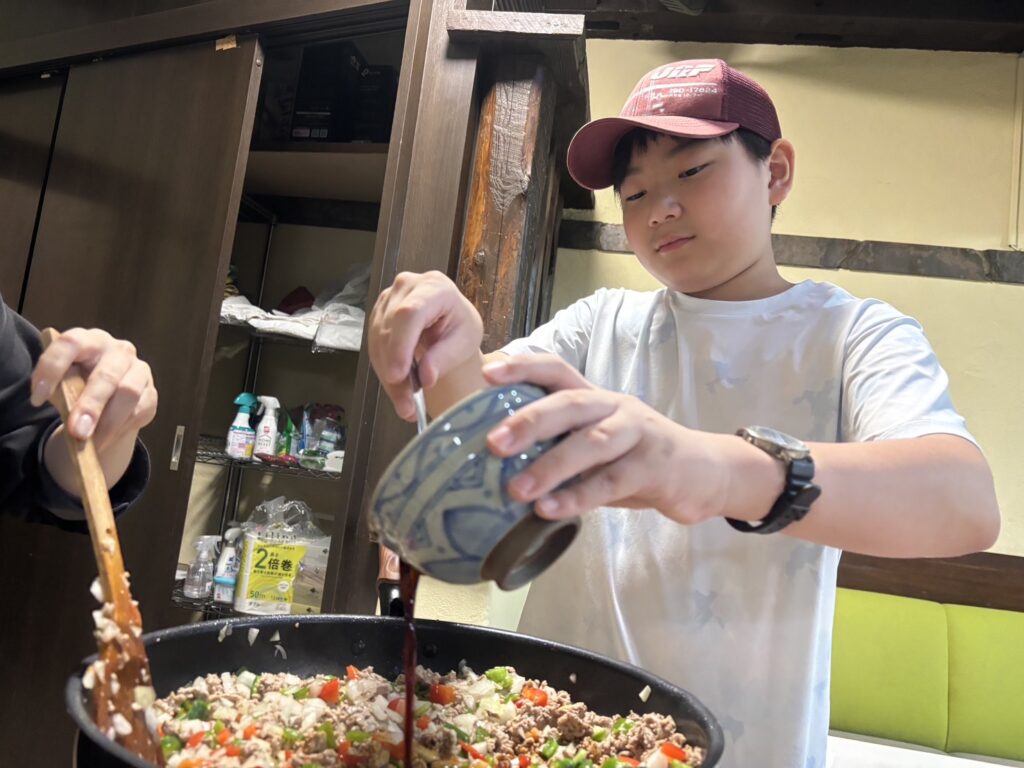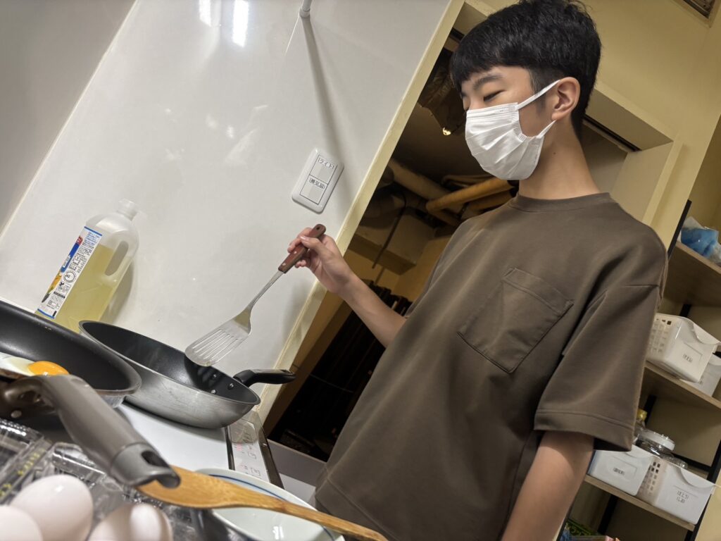 切り終わったら、具材を炒めるチームと目玉焼きを焼くチームに分かれて調理スタート。
