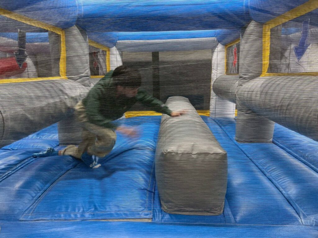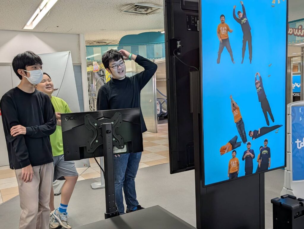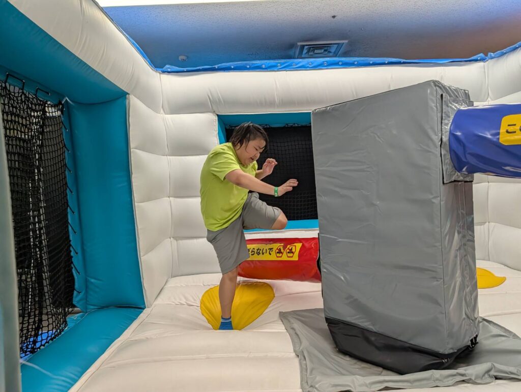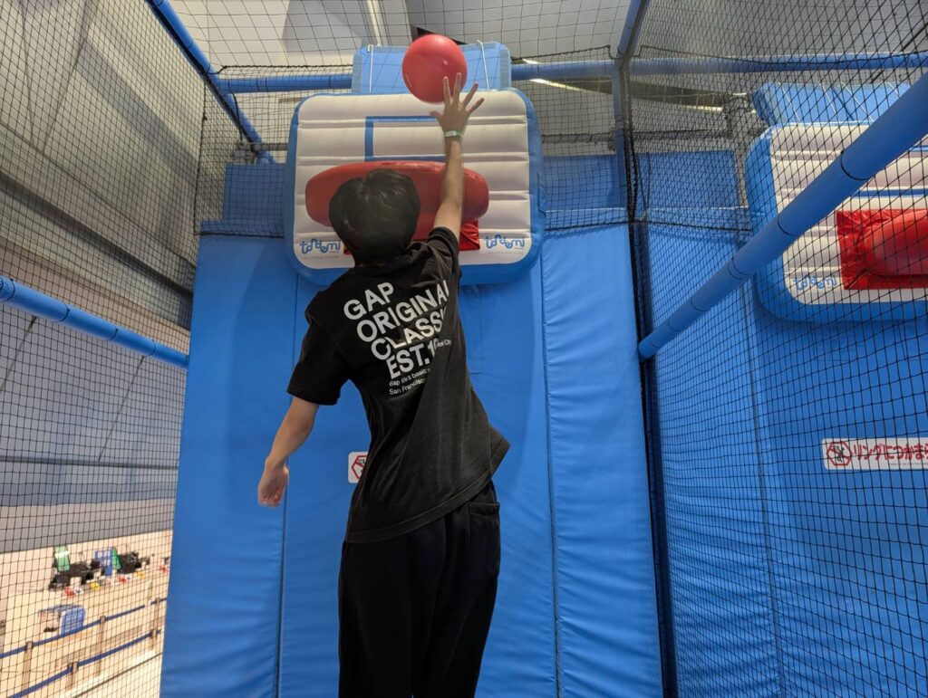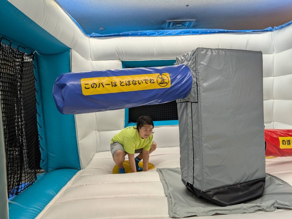 回るバーを避ける、ジャンプやしゃがんだりといった動作が大事になるマシーンや、トランポリンで跳ねながらバスケットゴールにシュートしたり、こちらは押し相撲でしょうか?