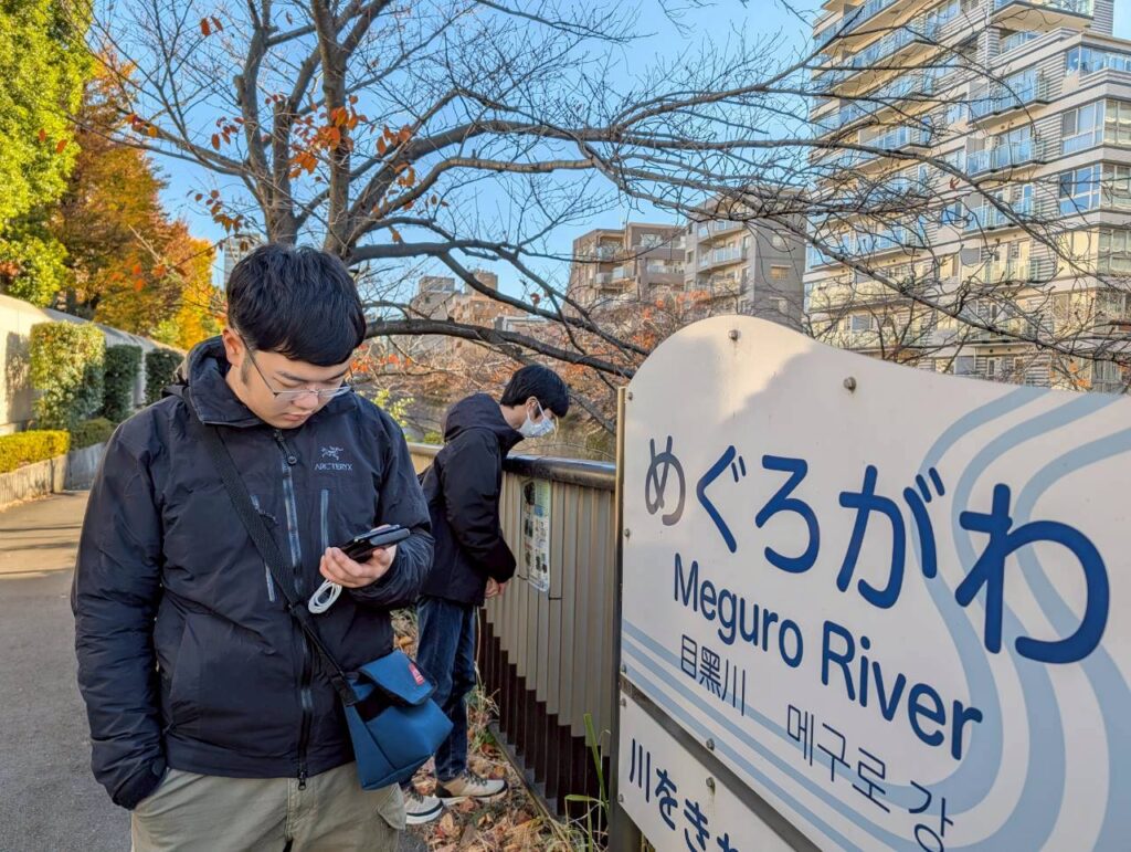 公園で一休みした後、目黒川に到着!