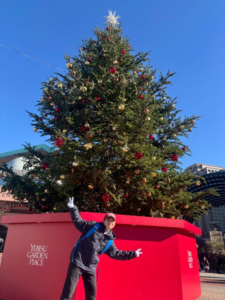 大きなクリスマスツリーの前で記念写真。